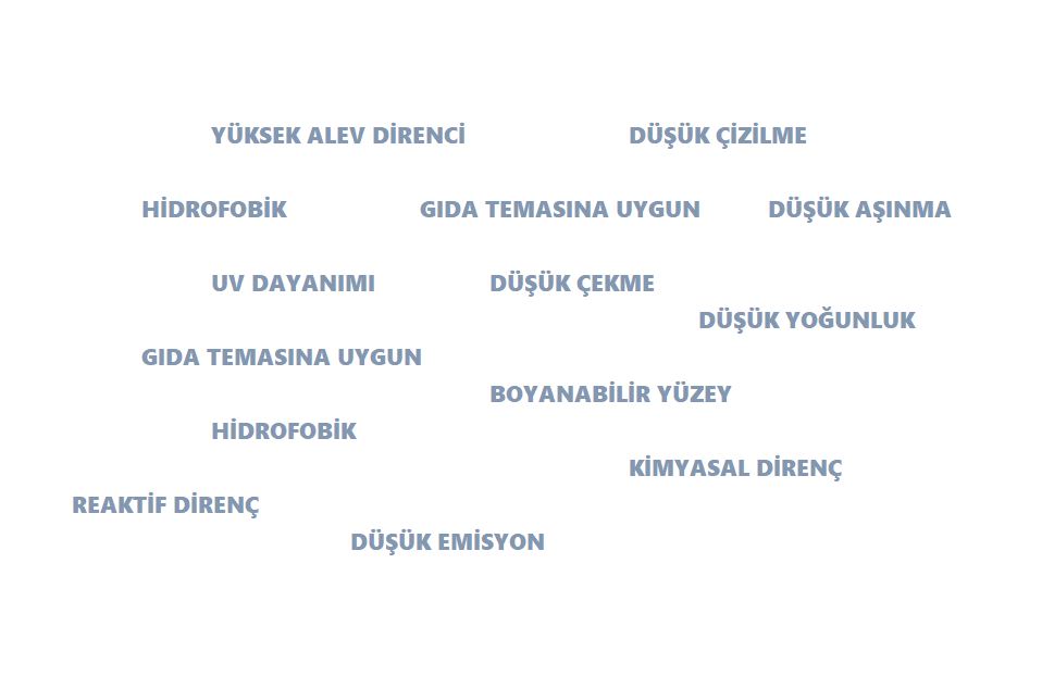 Kimyasal maddelere karşı dayanıklılık: Temizlik maddeleri, solventler, buhar ve su.