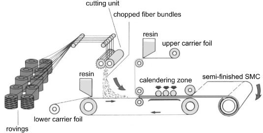 SMC (Sac Kalıplama Bileşiği), mineral dolgu maddeleri ve farklı katkı maddeleri içeren, termoset reçine matrisinde cam elyaf takviyeli bir bileşiktir. Genellikle organik matris olarak termoset doymamış polyester veya vinil-ester reçineleri kullanılır.